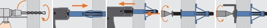 Tyto hmoždinky vyžadují ke své aplikaci montážní kleště, pomocí kterých se za kotveným materiálem smrští a zajistí. Průměr vhodného vrtáku je roven průměru kotvy.