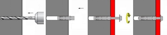 Kotvy KOS s vnitřním závitem jsou vhodné pro předsazenou montáž. Vyvrtejte otvor (průměr vhodného vrtáku je roven průměru kotvy) a zasuňte do něj kotvu. Utahováním šroubu se kotva zajistí v materiálu.
