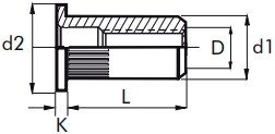 | Rozměr (D x L) | Vnější průměr (d1) | Průměr hlavy (d2) | Výška hlavy (K) | Síla materiálu |