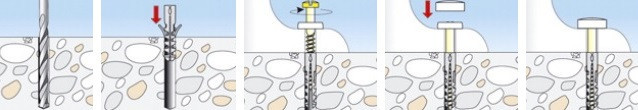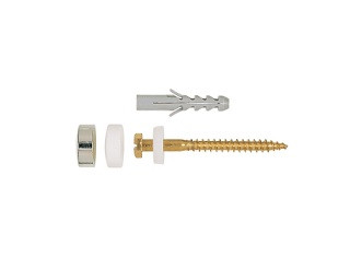 Sada pro rychlou a snadnou montáž volně stojících toalet a bidetů obsahující dvě hmoždinky o průměru 8 mm, odpovídající mosazné vruty se šestihrannou hlavou a plochou drážkou, dvě plastové podložky a bílé či chromované krytky.