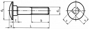 | Průměr (d1) | Čtyřhran (v / f) | Průměr hlavy (d2) | Výška hlavy (k) | Závit (b pro L ≤ 125) | Závit (b pro 125 < L ≤ 200) | Závit (b pro L > 200) |