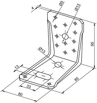 Statický kotevní prvek s otvory, vyrobený z ocelového pozinkovaného plechu o síle 4 mm.