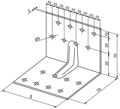 Úhelník se používá pro spojování prvků dřevěných tesařských a jiných konstrukcí, jako spojovací materiál slouží konvexní hřebíky či vruty o průměru 4 mm.